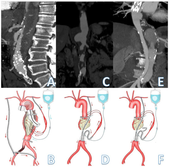 Schematic representation passive shunt according to the extension of the thoracoabdominal aortic aneurysm. Visceral and lower limb perfusion is assured by the passive shunt while Custodiol solution is used for renal arteries perfusion. A patient presenting with a type II dissecting TAAA. (A,B) Preexisting axillo-bifemoral bypass was used to perfuse the lower limbs while a second graft anastomosed to the LSA provided flow to the visceral vessels. (C,D) A PS between the LSA and the infrarenal aorta was created using a reversed bifurcated 8 mm Dacron graft for visceral perfusion during treatment of a type III TAAA. (E,F) A PS between the LSA and infrarenal aorta assure revascularization of CT, SMA, and intercostal artery during surgical repair of a type II-dissecting TAAA in a patient who has previously undergone TEVAR. The arrows indicate the direction of the blood flow from the inflow vessel to assure visceral perfusion during aortic cross-clamping.