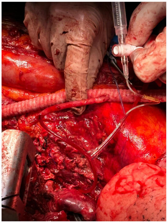 Passive shunting is manufactured with an 8–10 mm Dacron prothesis at the end of which is positioned a “Y-bifurcated” line with two 9F Pruitt occlusion-perfusion balloon catheters. The Pruitt catheters are inserted directly into the celiac and superior mesenteric arteries for antegrade selective perfusion (Figure 1, Figure 2 and Figure 3).