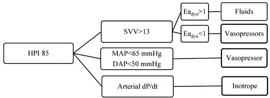 The trigger for any intervention was the HPI value of 85; then a decision tree was represented in a secondary screen according the following algorithm: in case of fluid responsiveness (i.e., SVV > 13) a bolus of 100 mL of crystalloids was adopted in case of low vascular compliance (Eadyn > 1); with SVV > 13 and Eadyn < 110 mcg of norepinephrine was administered. This drug was also given in case of non-fluid responsiveness (SVV < 13 with MAP < 65 mmHg and/or DAP < 50 mmHg). The inotropic agent ephedrine was administered in case of arterial dP/dt < 400.
