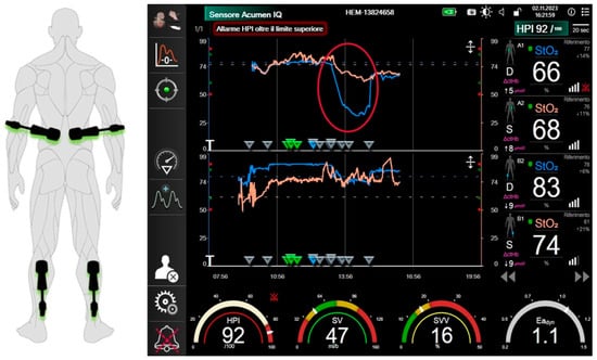 For all patients, a preoperative radial arterial cannula was placed (20G, Vygon) and connected to the advanced monitoring platform Hemosphere (Edwards LifeSciences, Irvine, CA, USA). A predictive algorithm (Figure 4) was adopted by using the Hypotension Prediction Index (HPI), to avoid arterial hypotension (Mean Arterial Pressure, MAP > 65 mmHg) and hemodynamic instability. The Hemosphere platform was used continuously throughout the procedure, and the anesthesiologist was responsible for interpreting the data in real time.