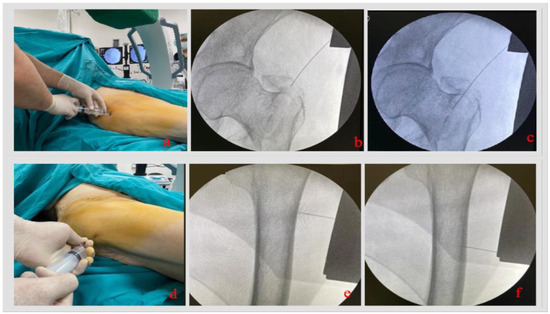 Figure 1. Injection of a local anesthetic under fluoroscopic control. (a) The spinal needle is inserted approx. 5 cm proximal to the tip of the greater trochanter. (b) The tip of the greater trochanter, where the first access will be made, is reached with the spinal needle under fluoroscopic control. (c) The drug is injected into the intramedullary space: The drug is applied into the intramedullary canal by inserting it into the fracture line. (d) The distal injection is made proximally. (e,f) Application of periosteal anesthesia in the estimated area where the lag screw and distal locking screw will be inserted.