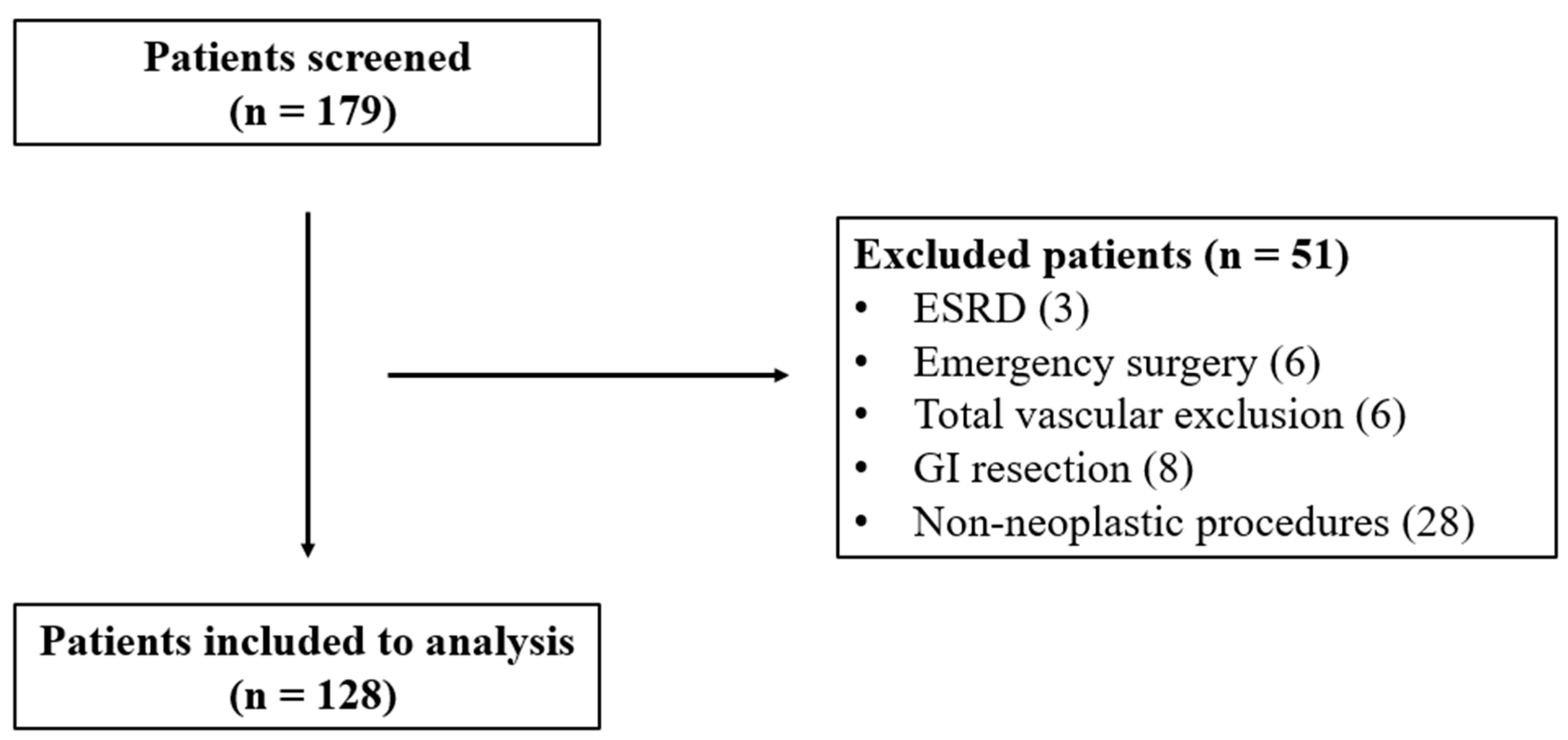 - Lee, K.F.; Lo, E.Y.J.; Wong, K.K.C.; Fung, A.K.Y.; Chong, C.C.N.; Wong, J.; Ng, K.K.C.; Lai, P.B.S. Acute kidney injury following hepatectomy and its impact on long-term survival for patients with hepatocellular carcinoma. BJS Open 2021, 5, zrab077. [Google Scholar] [CrossRef]