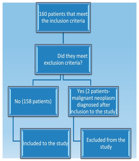 Patients with the earliest signs of illness kidney disease or recurrence who visited our clinic between 2013 and 2020 were enrolled in the trial prior to starting immunosuppressive therapy (such as cyclophosphamide and steroid pulses) and before starting ACE (angiotensin converting enzyme) inhibitor treatment. At the time of enrollment or during the preceding six months, none of the study participants received any medication. Because of the design of the trial, there was no randomization. Only patients with a histopathologically confirmed diagnosis of either cytoplasmic (c) or perinuclear (p) positive cytoplasmic antibodies against neutrophils (ANCA) vasculitis, IgA (immunoglobulin A) nephropathy, non-IgA mesangial proliferative glomerulopathy, primary FSGS (focal and segmental glomerulosclerosis), or membranous nephropathy were included in the study. Additionally, the patients had to have proteinuria (at least 60 mg per day) at the time of their most recent (one or two days before material collection) available urine evaluation in order to be included. The study excluded patients with active infections, dialysis, kidney transplants, or a history of cancer, either past or present. All these diagnoses can modulate the immunological system and influence the antibody level results. A total of 22 healthy people of Caucasian descent who satisfied the following requirements made up the control group: they had no history of kidney, autoimmune, or neoplastic problems in anamnesis. Their CRP levels were less than 5 mg/dL, their creatinine levels were not higher than 1.3 mg/dL, and they did not have proteinuria or erythrocyturia. Control group consisted of workers at our clinic, and their inclusion was consecutive and random without additional selection criteria apart from those mentioned above. A flowchart showing the steps involved in including study participants is shown in Figure 1.