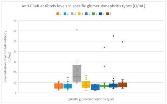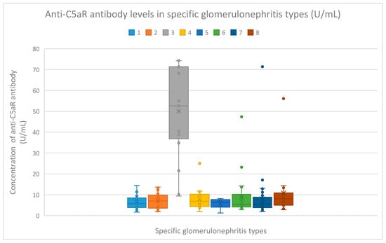 Anti-C5aR antibody levels (U/mL) in particular kinds of glomerulonephritis. The anti-C5aR antibody levels in patient groups 1–8 are represented by the bars with colors denoted by numbers 1–8. The antibody concentration (U/mL) is shown on the y-axis. Points represent patients. The median value is shown by X. 1—membranous nephropathy; 2—focal and segmental glomerulosclerosis; 3—lupus nephritis; 4—IgA nephropathy; 5—non-IgA mesangial proliferative glomerulonephritis; 6—the control group; 7—c-ANCA-positive vasculitis; 8—p-ANCA-positive vasculitis.
