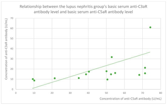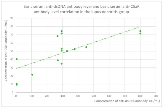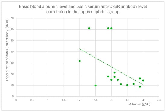 Basic serum albumin level and basic serum anti-C3aR antibody level were correlated in the lupus nephritis group (r = −0.54; p = 0.02). Specific patients are represented by green dots. The trend line is the green dotted line.