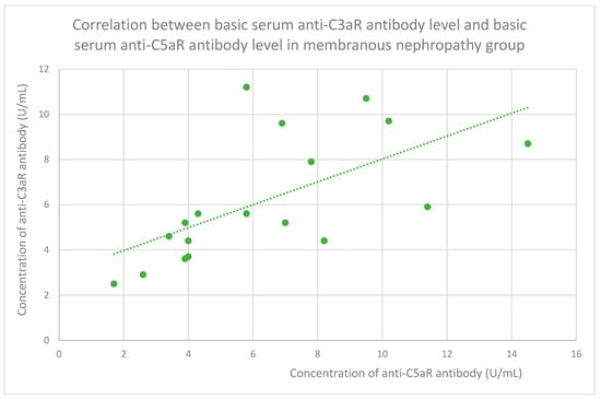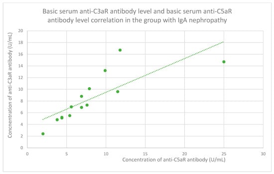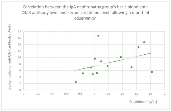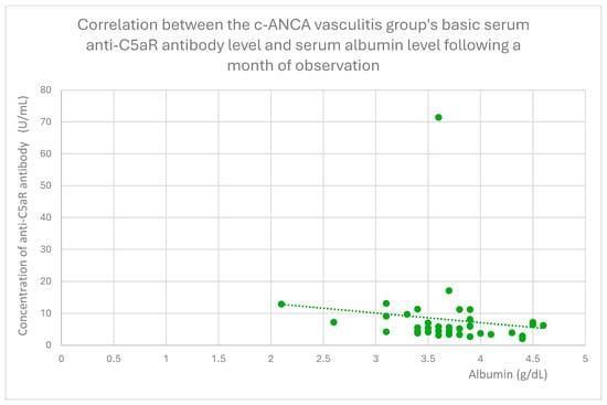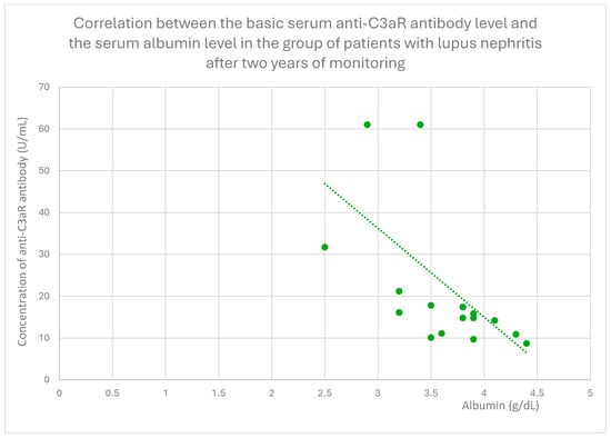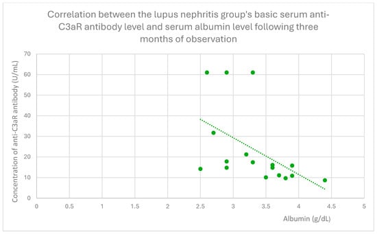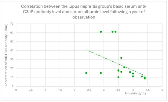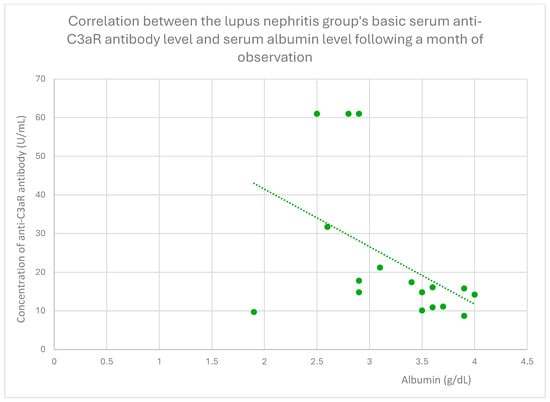 The lupus nephritis group showed a correlation between the basic serum anti-C3aR antibody level and serum albumin level after one month of monitoring (r = −0.51; p = 0.04). Specific patients are represented by green dots. The trend line is the green dotted line.