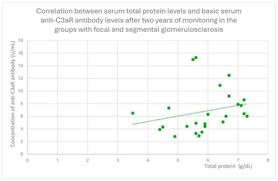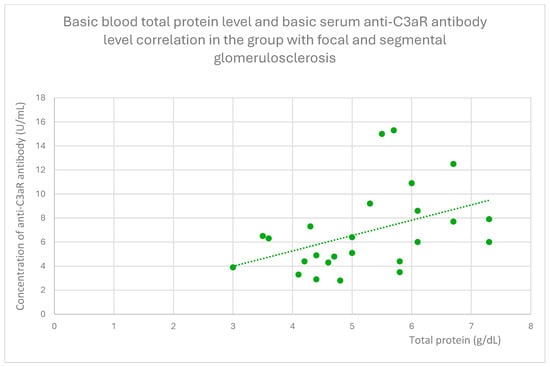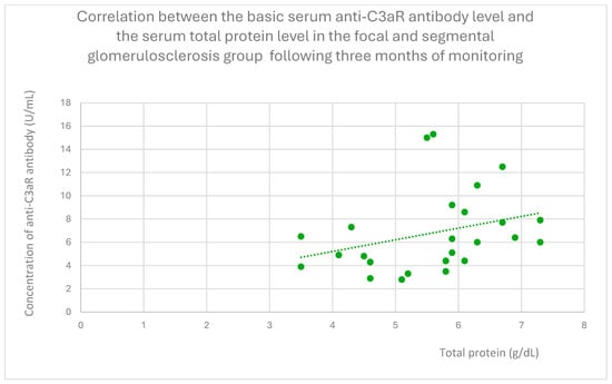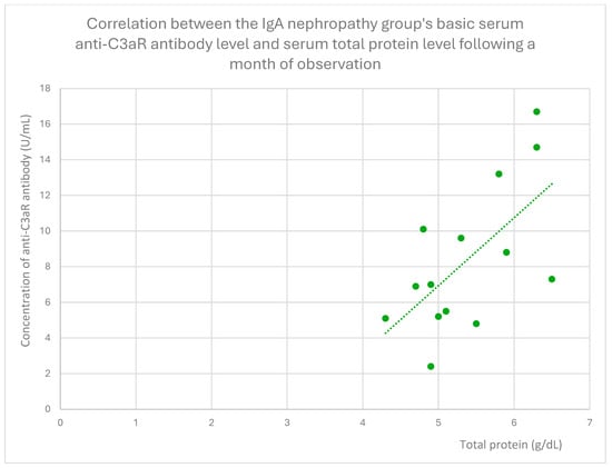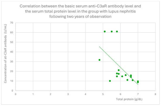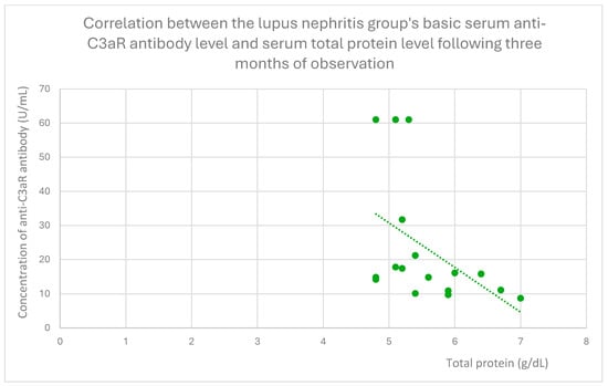 Correlation between the lupus nephritis group’s basic serum anti-C3aR antibody level and serum total protein level following three months of observation (r = −0.52; p = 0.04). Specific patients are represented by green dots. The trend line is the green dotted line.