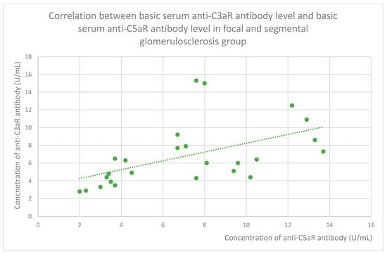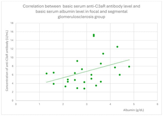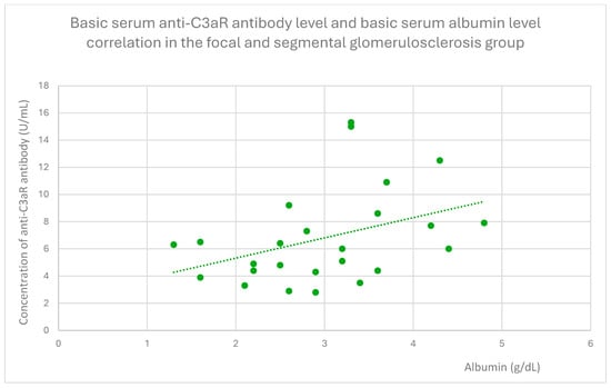 Correlation between basic serum anti-C3aR antibody level and basic serum albumin level in focal and segmental glomerulosclerosis group (r = 0.41; p = 0.03). Specific patients are represented by green dots. The trend line is the green dotted line.