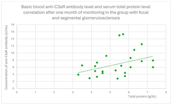 Anti-C3aR antibody levels also correlated positively with baseline albumin (Figure 12) and total protein levels at baseline (Figure 13) and after 1 month (Figure 14), 3 months (Figure 15), and 2 years (Figure 16) of observation in the focal and segmental glomerulosclerosis group.