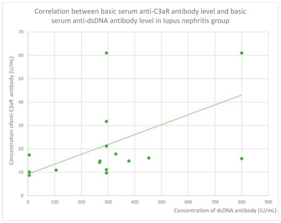 The anti-C3aR baseline serum antibody level correlated negatively with serum albumin level at baseline (Figure 4) and after 1 month (Figure 5), 3 months (Figure 6), 12 months (Figure 7), and 2 years (Figure 8) of observation in the lupus nephritis group. Furthermore, after three months (Figure 9) and two years (Figure 10) of monitoring, the anti-C3aR antibody level in the same group showed a negative correlation with the serum total protein level. Moreover, the anti-C3aR antibody level in the lupus nephritis group correlated positively with the serum anti-dsDNA (anti-double-stranded deoxyribonucleic) antibody level (Figure 11).
