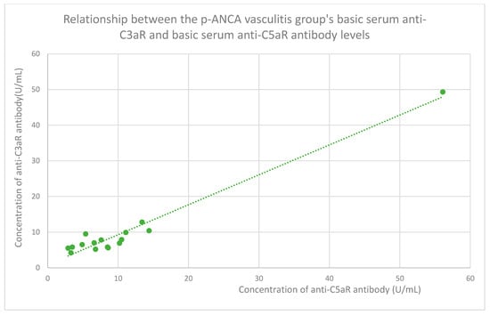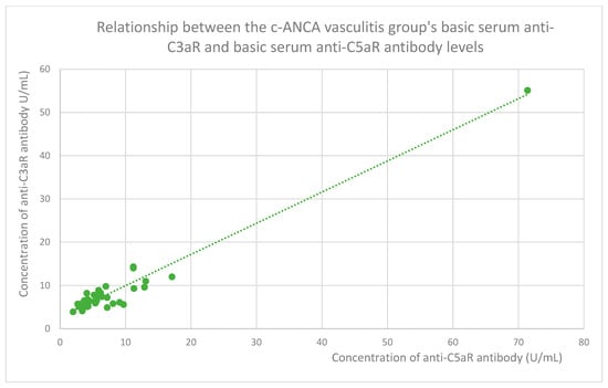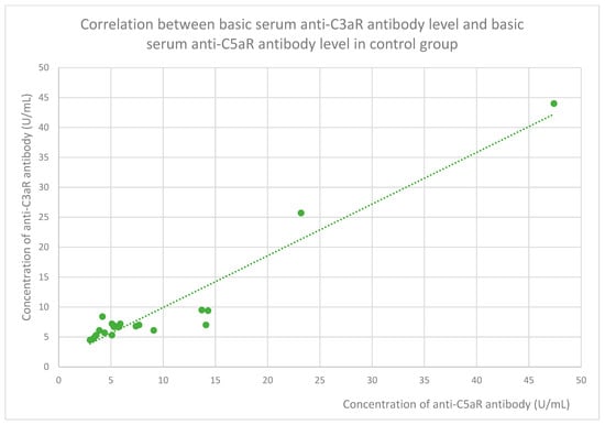 Using enzyme-linked immunosorbent assay (ELISA) kits received from Cell-Trend in Luckenwalde, Germany, the serum concentrations of anti-C3aR and anti-C5aR antibodies were determined according to the manufacturer’s guidelines: the anti-C3aR antibody kit and the anti-C5aR antibody kit. Microtiter plates were initially coated with C3aR and C5aR, followed by the addition of diluted samples (1:100), which were incubated at temperatures ranging from 2 to 8 °C for two hours. Horseradish peroxidase (POD)-conjugated anti-human IgG (1:100) was used to identify anti-C3aR and anti-C5aR antibodies following the washing procedures. This was followed by the development of a 3, 3′, 5, 5′-tetramethylbenzidine (TMB) substrate solution. The optical density was consequently translated into a concentration via a standard curve after measurements were taken at 450 nm with a correction according to 630 nm wavelength. A value of ≥2.5 U/mL was deemed positive, while a value of <2.5 U/mL was classified as negative for both anti-C3aR and anti-C5aR antibodies. The ELISA (enzyme-linked immunosorbent assay) procedures were validated in line with the FDA’s (Food and Drug Administration) Bioanalytical Method Validation Guidance for Industry []. There were no significant cross-reactions with different lupus antibodies found.