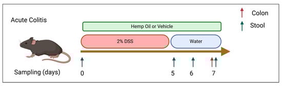 Schematic of experimental design. Colitis is induced using a 2% DSS solution administered via drinking water. Cannabinoids were administered via diet or i.p throughout the course of DSS treatment.