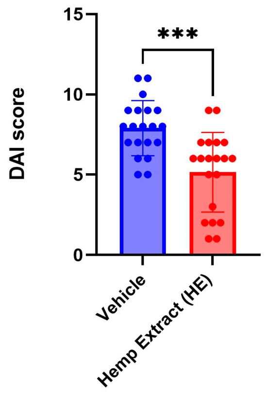 Disease activity index (DAI) scores measured on day 7 of the DSS treatment when inflammation is at the peak. The DAI scores in the cannabinoid-treated group are significantly lower than the vehicle-treated group (n = 20 mice/group, *** p < 0.005).