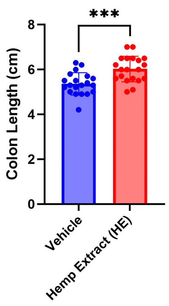 The disease activity index (DAI) scores (% weight loss, stool consistency, and presence of fecal occult blood, Table 1) were assessed daily. The DAI scores were significantly lower in animals receiving HE compared to a vehicle (Figure 2). As a consequence of colitis, reduction of colon length is commonly observed in DSS-colitis mice. HE treatment helped in restoration of the colon length, aiding in recovery from UC (Figure 3). No changes were noted in colon length in animals that did not receive DSS but received either vehicle or hemp extract in Nutella (Supplementary Figure S1).