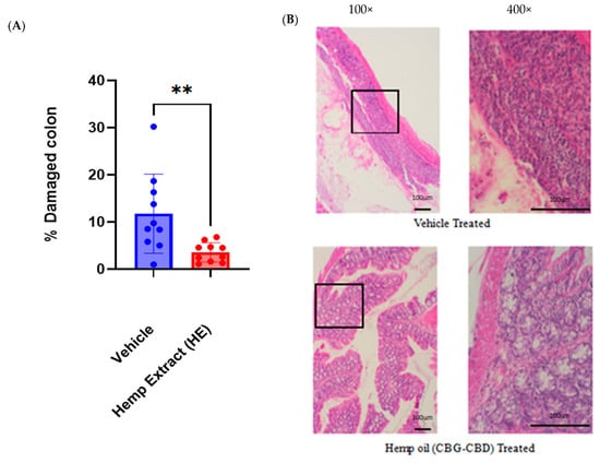 Colonic damage was assessed using H&E staining. (A) Colon damage (ulceration) was significantly lower for HE treated mice than control mice as measured by percentage of damaged epithelium. (B) Representative images (100×) of vehicle-treated and hemp oil-treated mouse colon highlighting damage to the colon; boxed region is shown at higher magnification (400×). (n = 10 mice/group, ** p < 0.01).