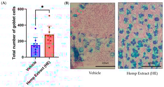 Hemp extract treatment increased goblet cell numbers. (A) The quantity of goblet cells is significantly higher in the HE-treated colitic mice compared to vehicle-treated. (B) Representative images (400×) of alcian blue stained colonic tissue from vehicle-treated and HE-treated mouse colon showing goblet cells (n = 10 mice/group, * p < 0.05).