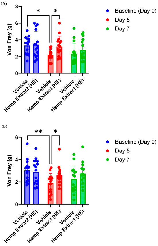 Using the DSS model of colitis, we demonstrate that a hemp extract high in CBG and CBD can help to improve inflammation and a proxy measure of abdominal pain. In particular, oral administration of HE results in reduced colonic damage, reduced disease activity index (DAI) scores, an increased number of goblet cells, and decreased abdominal wall sensitivity to mechanical stimulation. These findings are in line with our previous work showing that i.p. administration of HE reduces colonic damage [33]. The increased number of goblet cells observed in our current study may reflect the overall decrease in epithelial damage observed, or it may indicate that mice treated with HE have a faster recovery from DSS-induced epithelial damage. Interestingly, we noted a decrease in pain responses in mice treated with HE at the end of DSS treatment, but not on day 7 despite observing decreased tissue damage at this timepoint. Furthermore, only oral administration of HE was able to reduce somatic hyperalgesia in the hind paw. The mechanism by which HE reduces pain during and following colitis will need to be examined in future studies.