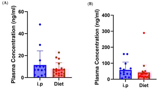 Mice were anesthetized on day 7 of the study, and trunk blood was collected by decapitation. Whole blood was centrifuged at 4 °C at 2000 RPM for 10 min, and plasma was collected and stored at −80 °C until further analysis. Plasma concentrations of CBG and CBD were determined using HPLC-Mass spectroscopy. As previously described, standard curves were constructed by plotting the ratio of the analyte peak area to internal standard peak area vs. analyte concentration [41].