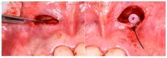 Group 2 (decompression group): Underwent the same protocol as Group 1, but with adjunctive decompression. A small incision was made in the buccal mucosa, a drain inserted to allow cystic drainage for 48 h, followed by completion of endodontic therapy two weeks later. At the second appointment (after 3 weeks), calcium hydroxide was removed, and canals were re-irrigated; however, persistent serous exudate was observed. As adequate drying remained unattainable, calcium hydroxide was re-applied, and the tooth was temporarily restored. During the same session, decompression was performed under local anesthesia. A small incision was made in the mobile buccal mucosa using a No. 15 Bard-Parker surgical blade, penetrating the cystic lining. A drainage tube was inserted through the buccal cortical plate and sutured at the mucosal margins to allow for continuous evacuation of the lesion content. The drain was removed after 48 h. Endodontic treatment was completed approximately two weeks later, once secretion had resolved (Figure 1).