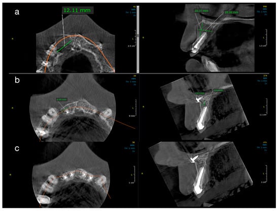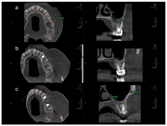 Radiological assessment was conducted using the OP 3D™ Pro CBCT unit (KaVo Dental GmbH, Biberach, Germany) and measurements were performed using OnDemand3D™ software (version 1.1 (build 1.0.10.1007) Cybermed Inc., Seoul, Republic of Korea). Lesion dimensions were recorded in three planes—mesiodistal, buccolingual, and vertical (height)—using the software’s built-in linear measurement tools. The same operator performed all measurements under standardized conditions, using a calibrated high-resolution monitor. For reliability, a second examiner independently repeated 30% of the measurements. Intraclass correlation coefficients (ICCs) were calculated, yielding values >0.90 for all measurements, indicating excellent inter-observer agreement. The mean of two repeated measurements was used for analysis. The CBCT voxel size was 0.2 mm, and slice thickness was 1 mm.