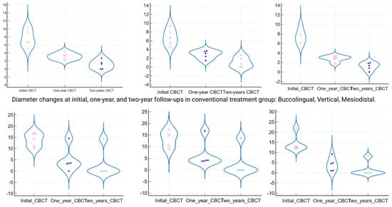 Violin plots of lesion size distribution in all three planes at baseline, 1 year, and 2 years (groups 1 and 2). Distribution of lesion dimensions (mesiodistal, buccolingual, and vertical) at baseline, 1-year, and 2-year follow-ups in both groups. Violin plots illustrate intergroup differences and the degree of variability over time. Group 2 showed greater initial lesion sizes and higher variance, especially at 1 year.