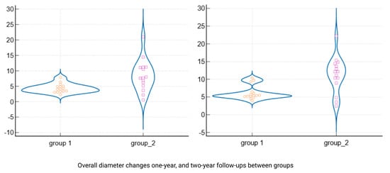 By the 12-month follow-up, the lesion dimensions had decreased markedly in both groups (Table 3). In Group 1 (standard endodontic therapy), the mean lesion diameter reduced from 7.3 mm at baseline to 2.93 mm (±0.75) at one year. In Group 2 (endodontic therapy + decompression), the mean lesion diameter decreased from 13.7 mm to 5.21 mm (±4.75) at one year. Although the lesions in Group 2 remained larger in absolute terms after 12 months, the difference between the two groups was no longer statistically significant (p = 0.087). Figure 4 presents violin plots of the lesion size distributions at baseline and one year, illustrating the substantial shift toward smaller lesion diameters in both cohorts. The spread of the violin plot for Group 2 at one year was broader, reflecting greater variability in healing outcomes among those larger initial lesions. By the 24-month follow-up, both groups showed further improvement. Group 1 lesions had a mean diameter of 1.12 mm (±0.98), and Group 2 lesions averaged 2.41 mm (±5.15). This slight residual difference was not statistically significant (p = 0.356). Radiographically, most lesions in both groups had resolved or nearly resolved by two years, with only very small radiolucencies, if any, remaining. It was observed that Group 2 continued to exhibit a higher variability in lesion size outcomes at 24 months (as evidenced by a larger standard deviation and wider confidence interval in Table 3). Importantly, within each group, the reduction in lesion size from baseline was highly significant. Both Group 1 and Group 2 demonstrated statistically significant lesion shrinkage at the 1-year and 2-year evaluations compared to baseline (intragroup comparisons, p < 0.001 for all). This confirms that both treatment approaches achieved effective and progressive lesion resolution over time in their respective groups.