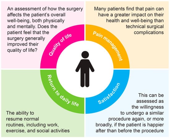 The patient-centered outcomes such as quality of life, pain management, and functional recovery are essential for assessing the success of benign surgical procedures. Including PROs in surgical evaluations ensures a comprehensive review, emphasizing the main goal of surgery: enhancing patients’ well-being. Important patient-reported outcomes in benign surgery may vary depending on the procedure, but generally include quality of life, pain control, return to daily activities, and overall satisfaction (Figure 1).