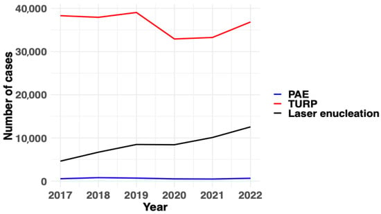 It should be stressed that the findings of our study are in line with previous epidemiological data suggesting a clear shift toward holmium and thulium enucleation of the prostate compared to conventional TURP due to their high safety and efficacy for patients with varying prostate sizes and comorbidities [22,23]. Although TURP remains the most common BPO surgery, it is steadily replaced by laser-based surgical treatment modalities [24,25]. Nevertheless, even though PAE seems to be a safe minimally invasive procedure, available evidence indicates that it is less effective than TURP or laser enucleation in the long term [26]. Randomized controlled trials on the matter demonstrate the superiority of TURP in terms of International Prostate Symptom Score, maximum urinary flow rate, reduction in postvoid residual urine, and reduction in prostate volume [27,28]. Accordingly, it seems that a substantial number of patients undergoing PAE require reoperation with TURP or laser enucleation in the long term. On the other hand, PAE has lower complication rates such as hematuria, urinary retention, urinary incontinence, erectile dysfunction, retrograde ejaculation, and urinary tract infection compared to TURP [29].
