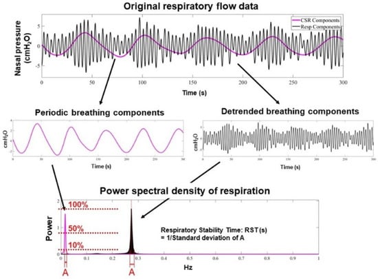 As summarized in Figure 1, respiratory patterns are digitized and sampled at 16–100 Hz [36]. We focus on two frequency ranges to estimate RST [35]. One range consists of respiratory frequency components obtained from the instantaneous ventilation signal with very high- or low-frequency noise removed via a bandpass filter with cutoff frequencies of 0.08 Hz and 0.6 Hz. The other components constitute a very low-frequency range of respiration as an indicator of periodic respiration power. These data are obtained by tracing the peak of the instantaneous ventilation signal, adjusting the baseline to zero, and applying a bandpass filter with cutoff frequencies of 0.008 and 0.04 Hz. For each 5 min epoch, the maximum entropy method is applied to these respiratory and periodic breathing curves to perform a spectral analysis of each wave [37]. All spectral power is normalized by the power spectral density, or the ratio of the maximum power of the components. This describes how the power of a signal or time series is distributed over frequency. All respiration frequency points with power spectral density > 10% are equally adopted in the standard deviation for the assessment of respiratory instability.