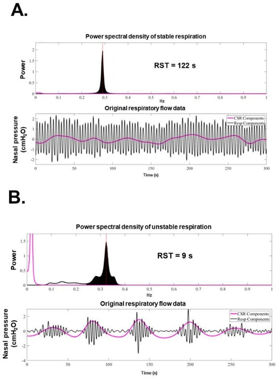 Representative examples of high and low RST during sleep [36]. (A) Stable respiration in a compensated patient with RST = 122 s, showing regular respiration and a narrow-band spectral distribution. (B) Irregular and periodic respiration in a decompensated patient with RST = 9 s, showing prominent ultra-low-frequency activity (i.e., Chain–Stokes respiration). Spectral and waveform analysis illustrates the association between respiratory irregularity and reduced RST.