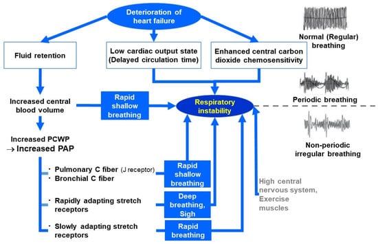 Pathophysiological mechanisms underlying respiratory instability in heart failure. Heart failure decompensation leads to pulmonary congestion, elevated pulmonary artery pressure, and stimulation of pulmonary stretch and C fibers. Simultaneously, low cardiac output and delayed circulation enhance central CO2 sensitivity. These factors induce irregular respiratory drive, resulting in abnormal patterns such as periodic breathing, rapid shallow breathing, and sighing, all of which decline RST levels. Reused with permission from Hidetsugu Asanoi.