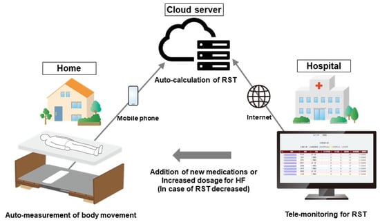 Contactless home monitoring system for RST measurement. RST is measured passively using a sensor placed beneath the mattress, which detects thoraco-abdominal motion without requiring wearable devices. Data are transmitted via a mobile phone to a cloud server and analyzed to calculate daily RST, enabling automated remote monitoring in heart failure patients.