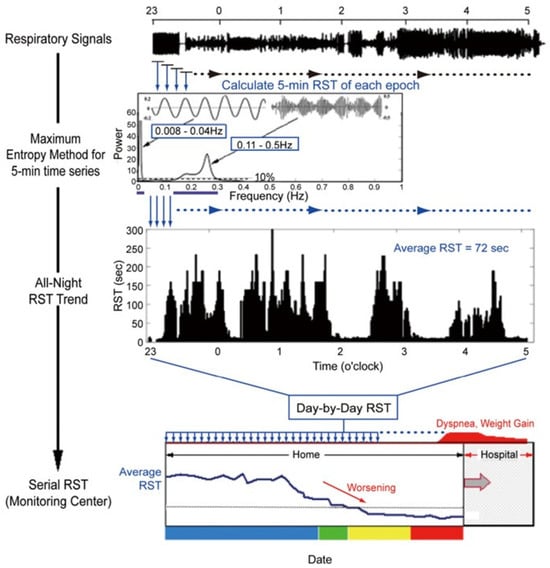 Advanced signal processing algorithms analyze the data to identify the interval variabilities of the respiratory rhythm for one epoch (5 min). The interval variabilities of all epochs are averaged to calculate the RST for each night. Because the monitoring occurs passively and automatically in the home setting, RST offers high adherence and allows for daily longitudinal tracking, even in elderly or frail patients who may struggle with conventional monitoring methods. Importantly, RST measurements obtained from under-mattress sensors have been validated against gold-standard assessments, including polysomnography and established congestion markers, confirming their accuracy and clinical reliability.
