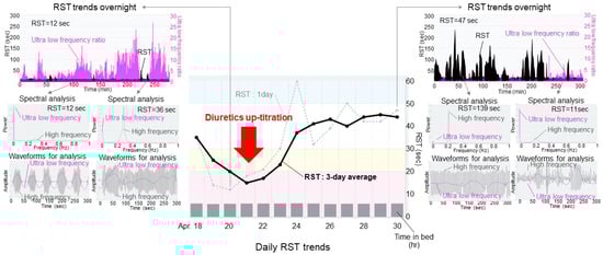 Similar to prior studies, a threshold around 20 s was observed. This low inter-patient variability in this threshold enhances the specificity of RST declines as indicators of physiological deterioration. Notably, in patients whose RST declined by more than a predefined threshold, the majority required hospitalization within the following two weeks. Furthermore, when the declined RST level could be increased following aggressive therapeutic interventions, such as the up-titration of the diuretic dose, re-hospitalization due to HF seems to be avoided. However, it is uncertain whether the aggressive therapeutic intervention in patients with declining RST below its threshold has clinical benefits, given the lack of prospective interventional studies.