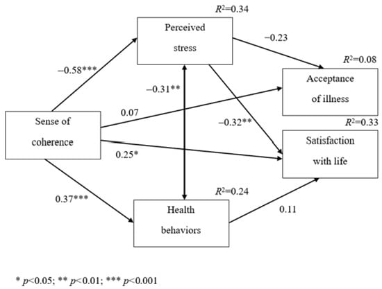 The fit indices indicated adequate fit of the analyzed model to the data. They were equal to CFI = 0.99, NFI = 0.99, SRMR = 0.02, and RMSEA = 0.01. The mediation effect in which the level of perceived stress was a mediator of the relationship between the sense of coherence and satisfaction with life was statistically significant, Beta = 0.19, p < 0.01. The higher the sense of coherence, the lower the level of perceived stress, and as a consequence, the higher the level of satisfaction with life. However, the level of perceived stress was not a statistically significant mediator of the relationship between the sense of coherence and acceptance of illness, Beta = 0.13, p > 0.05, due to the lack of a statistically significant relationship between the level of perceived stress and acceptance of illness. The sense of coherence was positively related to health behaviors, but the level of health behaviors was not a statistically significant mediator of the relationship between the sense of coherence and satisfaction with life, Beta = 0.04, p > 0.05, due to the lack of a statistically significant relationship between the level of health behaviors and satisfaction with life. The sense of coherence was also related directly and positively to satisfaction with life, but not to the acceptance of illness. The analyzed model explained 33.2% of the satisfaction with life variance and 7.5% of acceptance of the illness variance, and also 33.6% of the perceived stress variance and 24.1% of the health behavior variance.