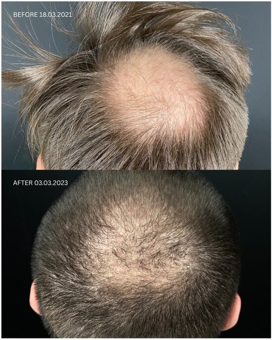 - Crisóstomo, M.R.; Crisóstomo, M.G.R.; Crisóstomo, M.C.C.; Gondim, V.J.T.; Benevides, A.N. Hair loss due to lichen planopilaris after hair transplantation: A report of two cases and a literature review. An. Bras. Dermatol. 2011, 86, 359–362. [Google Scholar] [CrossRef] [PubMed]