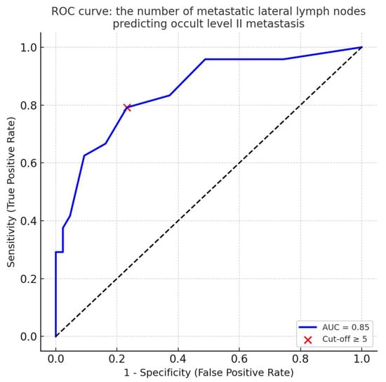 To further evaluate the predictive performance of the number of metastatic lateral lymph nodes, ROC curve analysis was performed. The ROC analysis demonstrated good discriminatory power, with an AUC of 0.85. The optimal cut-off value was identified as ≥5 metastatic lateral lymph nodes, yielding a sensitivity of 79%, a specificity of 77%, a positive predictive value (PPV) of 66%, and a negative predictive value (NPV) of 87% (