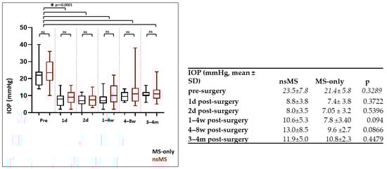 Development of IOP (mmHg) in the MS-only and nsMS groups from preoperative levels to the four-month follow-up visit (mean ± SD). IOP decreased significantly in both the MS-only and the nsMS group from before surgery to 4 months postoperatively (p < 0.001, Mann–Whitney U test). The reduction in IOP did not differ between the groups at all measured times up to 4 months postoperatively (d = day; w = week; m = month; ns = not significant).