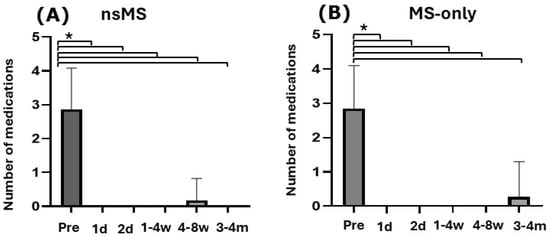 Histogram showing the number of IOP-lowering medications used preoperatively from day 1 to the 4-month follow-up visit (mean ± SD). In both groups, the average number of IOP-lowering medications significantly decreased after 3 to 4 months. (A) In the nsMS group antiglaucomatous medication decreased from 2.88 ± 1.19 to 0 (p < 0.0001; Fisher’s exact test) (B) In the MS-only group antiglaucomatous medication decreased from 2.75 ± 1.2 to 0.25 (p < 0.0001; Fisher’s exact test) (Pre = preoperatively; d = day; w = week; m = month; * p ≤ 0.0001)).