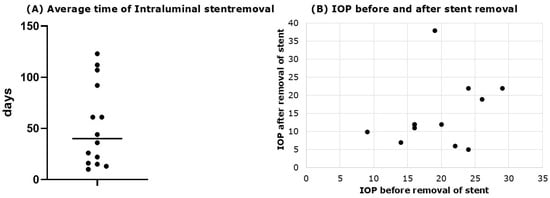 In 14 eyes (60.87%), the intraluminal stent was removed, with an average removal time of 52.72 ± 40.45 days [CI 95%: 29.35 to 76.09 days] (Figure 4) and a mean IOP reduction of 4.19 ± 3.6 mmHg [CI 95%: 2.11 to 6.27 mmHg] after removal. Pre-removal IOP was 18.86 ± 5.72 mmHg [CI 95%: 15.56 to 22.16 mmHg], dropping to 14.67 ± 9.31 mmHg [CI 95%: 9.29 to 20.05 mmHg] (p = 0.038, Mann–Whitney U test) (Figure 4).