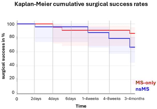 In the MS-only group, 85% (17/20) achieved complete success compared to 65.3% (15/23) in the nsMS group (p = 0.1396; Log-rank test). Qualified success was achieved in 90% (18/20) of the MS-only group and 82.6% (19/23) of the nsMS group (p = 0.1396; log-rank test). Kaplan–Meier survival curves for complete success are shown in Figure 5.