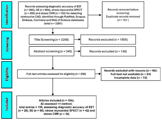 A comprehensive search was conducted across PubMed, Scopus, Embase, Cochrane, and Web of Science databases to identify studies evaluating the sensitivity, specificity, and diagnostic accuracy of EST, SE, stress myocardial SPECT, and stress CMR in detecting obstructive CAD. This initial search yielded 2381 records. After removing 181 duplicate entries (7.6%), an additional 1855 studies (77.9%) were excluded based on title screening, and 145 (6.1%) were removed following abstract review. The remaining 200 studies (8.4%) underwent full-text evaluation for eligibility. Of these, 24 (1%) were excluded due to unavailable full texts and 72 (3%) due to incomplete or missing data. Ultimately, 104 studies (4.4%) [26,27,28,29,30,31,32,33,34,35,36,37,38,39,40,41,42,43,44,45,46,47,48,49,50,51,52,53,54,55,56,57,58,59,60,61,62,63,64,65,66,67,68,69,70,71,72,73,74,75,76,77,78,79,80,81,82,83,84,85,86,87,88,89,90,91,92,93,94,95,96,97,98,99,100,101,102,103,104,105,106,107,108,109,110,111,112,113,114,115,116,117,118,119,120,121,122,123,124,125,126,127,128,129] involving a total of 16,824 symptomatic patients with suspected or known CAD were included in the systematic review and meta-analysis. Notably, 42 studies (40.4%) examined more than one diagnostic modality, resulting in 159 total analyses evaluating the performance of EST (n = 25), SE (n = 58), stress myocardial SPECT (n = 42), and stress CMR (n = 34) (Figure 1).