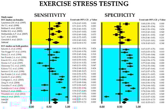 The combined sensitivity of EST for identifying obstructive CAD was 0.66 (95% CI: 0.59–0.72, p < 0.001), while the pooled specificity was 0.61 (95% CI: 0.55–0.67, p < 0.001). Subgroup analysis indicated that studies focused exclusively on female participants demonstrated low specificity, which did not reach statistical significance. The heterogeneity across studies was substantial, with I2 values of 91.5% for sensitivity and 89.5% for specificity (both p < 0.001).