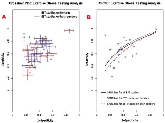 (A) Crosshair plot illustrating the results of EST studies conducted in two distinct subgroups—female-only and mixed-gender populations. (B) The SROC curve represents the overall diagnostic performance of EST across all studies (AUC = 0.69; 95% CI: 0.62–0.76), as well as for studies including only women (AUC = 0.65; 95% CI: 0.52–0.80) and those involving both sexes (AUC = 0.71; 95% CI: 0.61–0.78). EST, exercise stress testing; SROC, summary receiver operating characteristic.