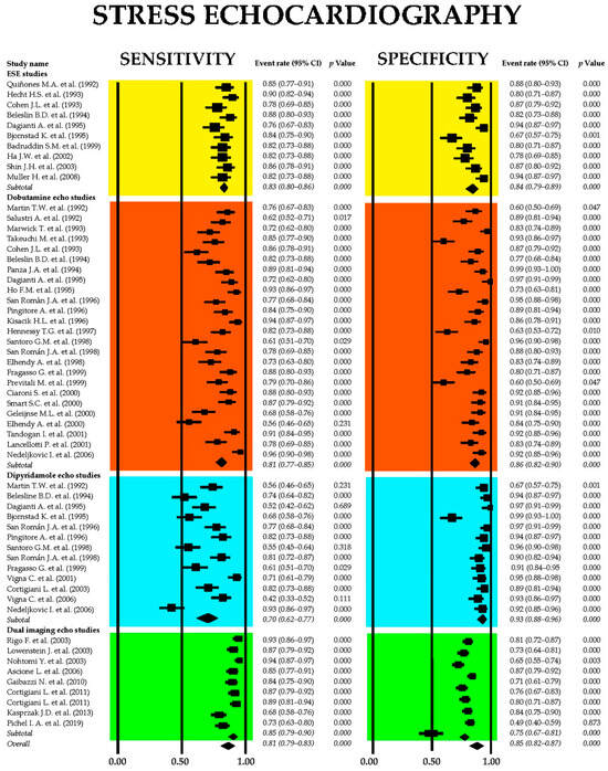 Figure 5 displays the combined sensitivity and specificity estimates for SE and its primary clinical modalities, including ESE, dobutamine stress echocardiography (DSE), dipyridamole stress echocardiography (dipSE), and dual-imaging SE.