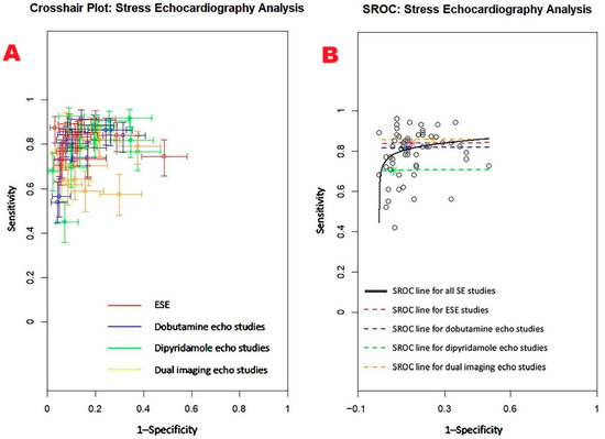 (A) Crosshair plot displaying the sensitivity and specificity results from studies evaluating various forms of stress echocardiography, including ESE, DSE, dipSE, and dual-imaging SE. (B) SROC curve illustrating the overall diagnostic accuracy of SE (AUC = 0.85; 95% CI: 0.80–0.91) and the individual performance of each technique: ESE (AUC = 0.84; 95% CI: 0.69–0.91), DSE (AUC = 0.82; 95% CI: 0.66–0.89), dipSE (AUC = 0.71; 95% CI: 0.46–0.86), and dual-imaging SE (AUC = 0.86; 95% CI: 0.75–0.91). DipSE, dipyridamole stress echocardiography; DSE, dobutamine stress echocardiography; ESE, exercise stress echocardiography; SE, stress echocardiography; and SROC, summary receiver operating characteristic.