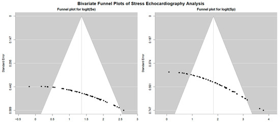 Sensitivity analyses reinforced the reliability of the overall findings. Stepwise exclusion of individual studies resulted in only minor fluctuations in sensitivity estimates across various stress echocardiography modalities. For ESE, sensitivity ranged from 0.83 (95% CI: 0.80–0.86, p < 0.001) to 0.87 (95% CI: 0.81–0.91, p < 0.001); in DSE studies, sensitivity varied from 0.69 (95% CI: 0.54–0.81, p = 0.01) to 0.82 (95% CI: 0.76–0.86, p < 0.001), while for dipSE studies, it ranged from 0.63 (95% CI: 0.52–0.72, p = 0.02) to 0.70 (95% CI: 0.63–0.76, p < 0.001). Finally, dual-imaging SE showed a sensitivity range between 0.87 (95% CI: 0.80–0.91, p < 0.001) and 0.91 (95% CI: 0.86–0.95, p < 0.001). Specificity estimates showed similar stability upon stepwise exclusion. For ESE, specificity ranged from 0.82 (95% CI: 0.76–0.87, p < 0.001) to 0.86 (95% CI: 0.81–0.90, p < 0.001); DSE studies reported specificity values from 0.88 (95% CI: 0.78–0.93, p < 0.001) down to 0.79 (95% CI: 0.58–0.91, p = 0.01), while for DipSE studies specificity ranged from 0.90 (95% CI: 0.61–0.98, p = 0.01) to 0.95 (95% CI: 0.85–0.98, p < 0.001). Finally, in dual-imaging SE studies specificity varied between 0.73 (95% CI: 0.63–0.81, p < 0.001) and 0.77 (95% CI: 0.66–0.85, p < 0.001).