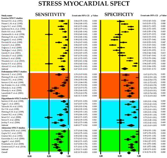 Figure 8 presents the combined sensitivity and specificity estimates for stress myocardial SPECT, including the main scintigraphic techniques commonly used in clinical settings—exercise, dobutamine, dipyridamole, and adenosine SPECT.
