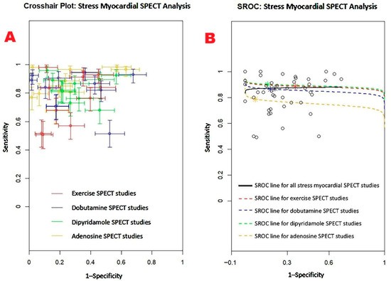 Figure 9 displays the crosshair plot (A), highlighting the sensitivity and specificity results for individual SPECT modalities—including exercise, dobutamine, dipyridamole, and adenosine-based protocols. The SROC curve (B) provides an overview of the diagnostic performance of stress myocardial SPECT and its principal clinical techniques.