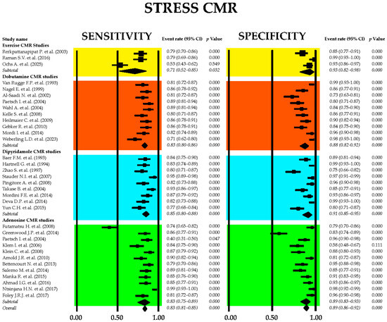 The combined sensitivity of stress CMR imaging for detecting obstructive CAD was 0.83 (95% CI: 0.81–0.85, p < 0.001), while the overall specificity was 0.89 (95% CI: 0.86–0.92, p < 0.001). Among the different stress CMR modalities, dipyridamole-based CMR exhibited the highest sensitivity at 0.85 (95% CI: 0.80–0.88, p < 0.001), whereas exercise CMR demonstrated the greatest specificity, reaching 0.93 (95% CI: 0.82–0.98, p < 0.001). Significant heterogeneity was observed among the included studies, with I2 values of 83.0% for sensitivity and 82.5% for specificity (both p < 0.001).